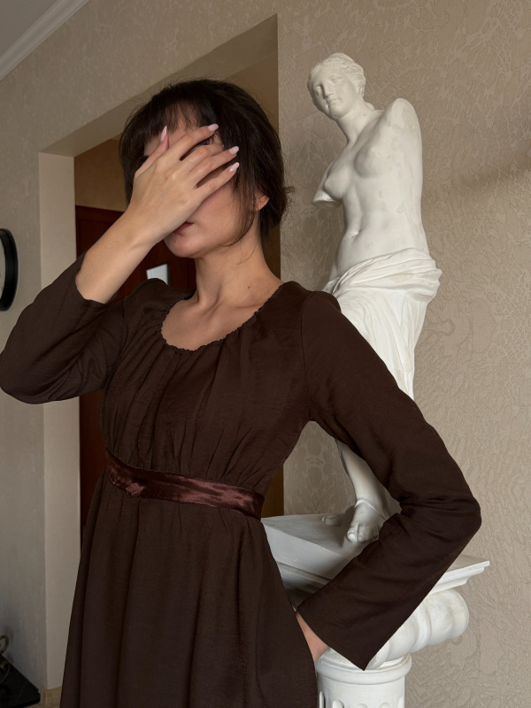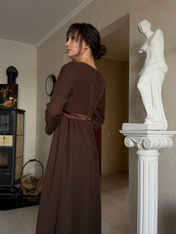 Длинное коричневое платье "Элизабет" вдохновлено нарядом Элизабет Беннет из фильма "Гордость и предубеждение" 2005 года экранизации. Лаконичный силуэт в стиле ампир с завышенной линией талии мягко вытягивает силуэт и подчёркивает естественную женственность.
