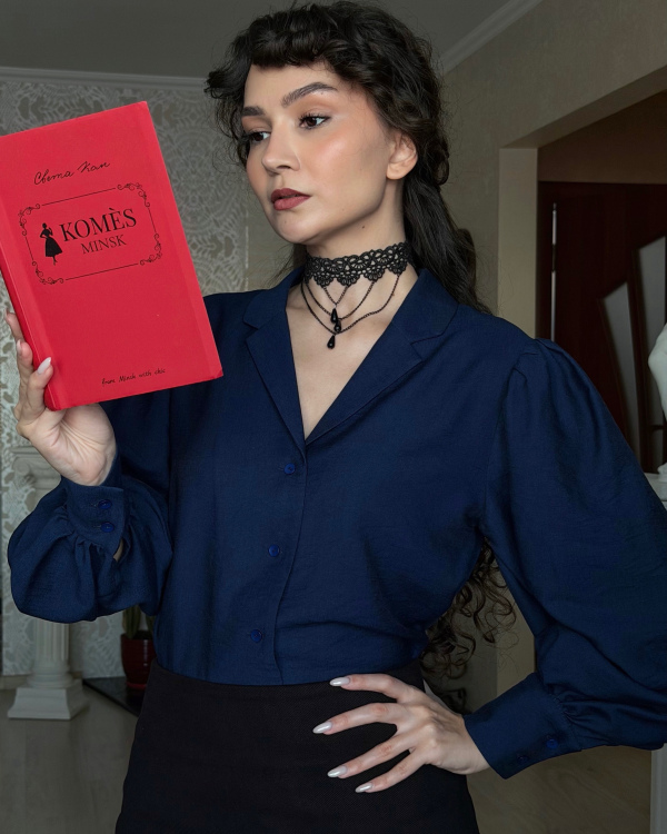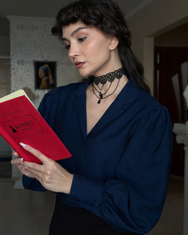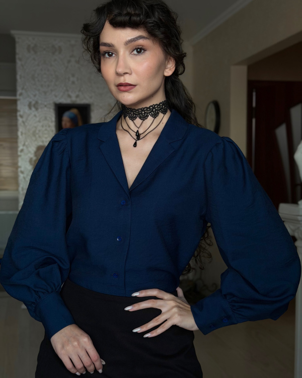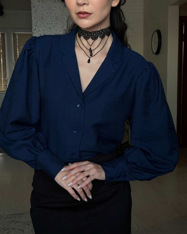 Глубокий синий цвет, изящный отложной воротник и выразительные объёмные рукава создают образ утончённой женственности и благородства.