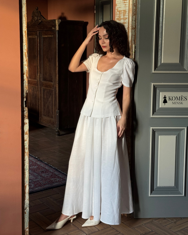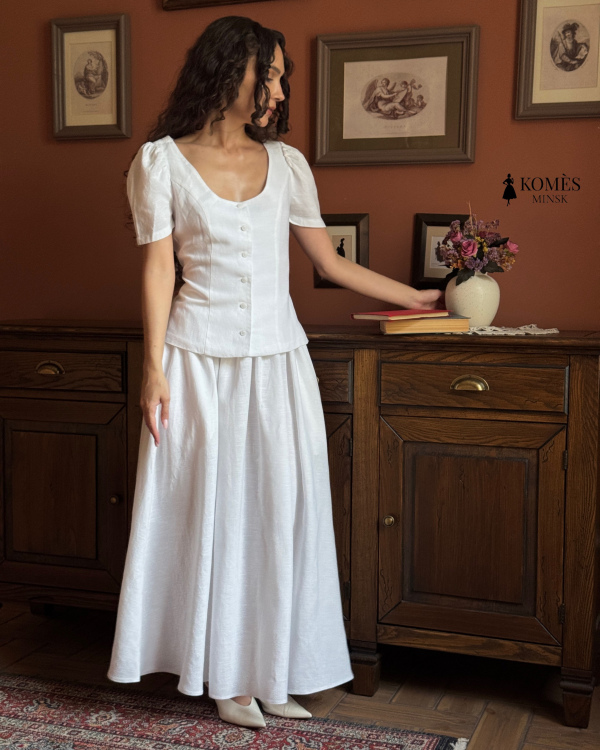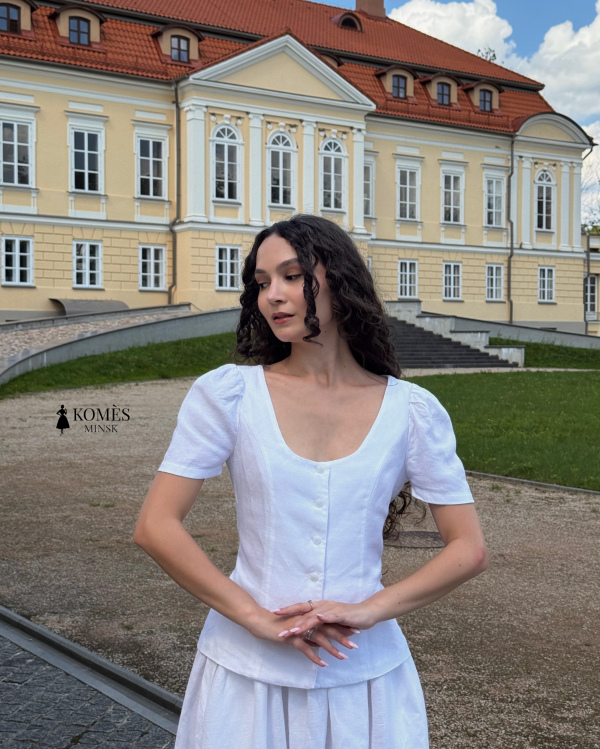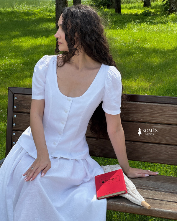 Блуза «Оливия» - воплощение женственности и элегантности. Выполнена из комфортной смеси льна и вискозы, она мягко подчёркивает талию и сохраняет форму. Короткие рукава-фонарики и аккуратная застёжка на пуговицы придают образу винтажное очарование. Благодаря завязкам на спине блуза идеально садится на талии