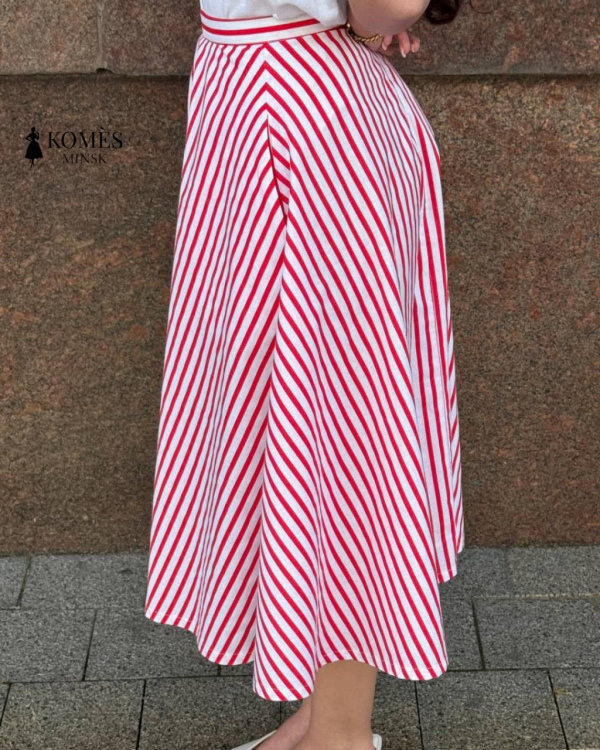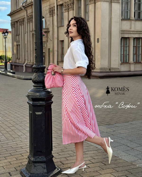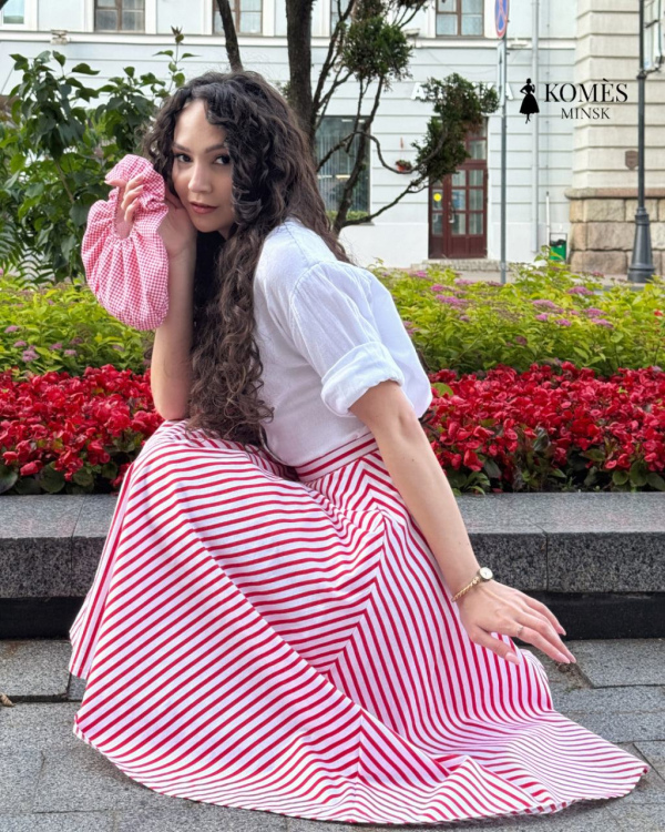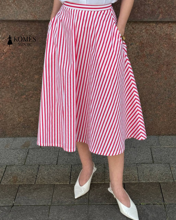 Яркая и элегантная юбка Софи вдохновлена изяществом моды 50-х годов. Силуэт полусолнце создаёт лёгкую динамику движения и подчеркивает талию. Яркая красно-белая полоска добавляет образу игривого настроения, а натуральный хлопок обеспечивает комфорт в любую погоду. Удобная длина миди позволяет сочетать юбку с классическими лодочками, балетками или лёгкими кедами. Эта модель легко станет основой как романтичного, так и повседневного гардероба.